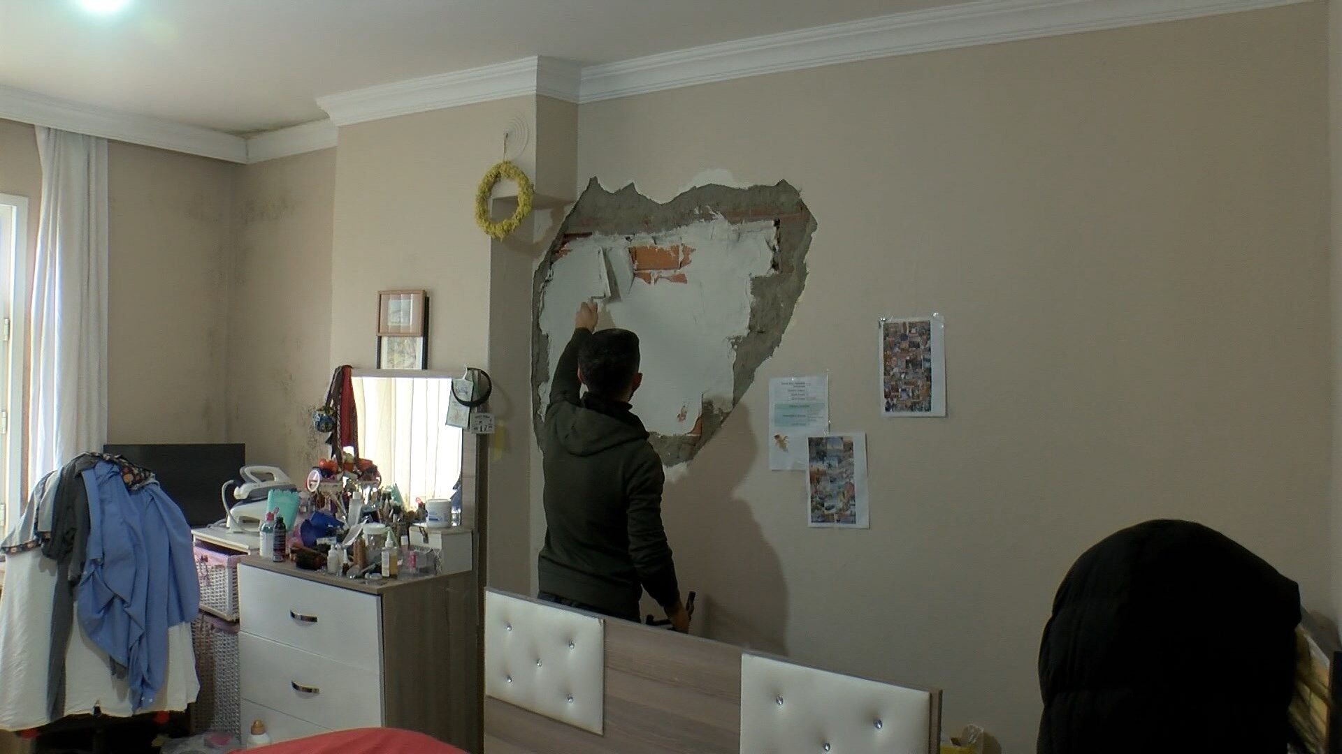 Delinen duvarda kafes bulunduğunu ve kuşlarının kaçtığını söyleyen Rıfat Akkoca, “Dün ben işteydim, annem aradı ‘Gel duvar delinmiş kuş kaçtı’ diye. Duvarla uğraşırken kuşların bir tanesini yakaladım biri de kayıp. Yatmak için bu odaya geldiğimizde duvardaki çatlakları fark ettik. Saat 23.00 gibi Küçükçekmece Belediyesi zabıta ekiplerini aradım.Zabıta geldi aşağıda bana bilgilendirme yaptılar, yukarıya çıkıp hiç bakmadılar. ‘Sabah erken saatte arayın erken gelirler’ dediler. İki kere aradım iki kere kayıt yaptırdım; ne arayan var ne soran var. Şu an ev sallanıyor. Duvarın yıkılması sonucu bazanın başı hasar almış. Kuşun bir tanesi kayıp. Kedinin yemesinden korkuyorum. Duvarlar çatlak. Ev sallanıyor. Biz de çıkacağız evden ama duvarın örülmesini bekliyoruz’. Duvar örülse bile yine yıkılacak.” diye konuştu.